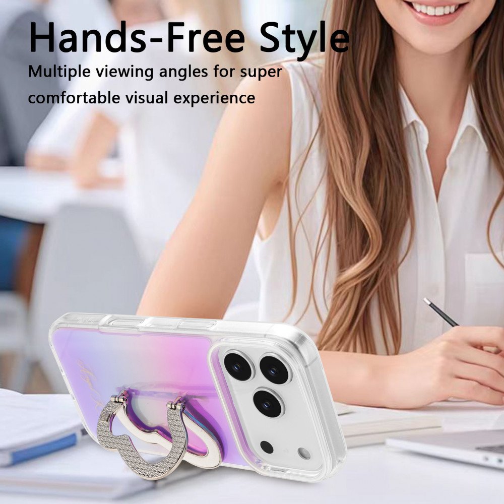 The Glitter Butterfly Kickstand Phone Case with Rainbow Gradient for Apple iPhone 17 Pro Max offers a stylish and functional design. It features a sparkling butterfly diamond kickstand for hands-free use, a vibrant rainbow gradient finish for standout style, and durable shock-absorbing construction to protect against drops, bumps, and scratches. Slim and lightweight, it ensures comfort in hand and easy pocket storage.
