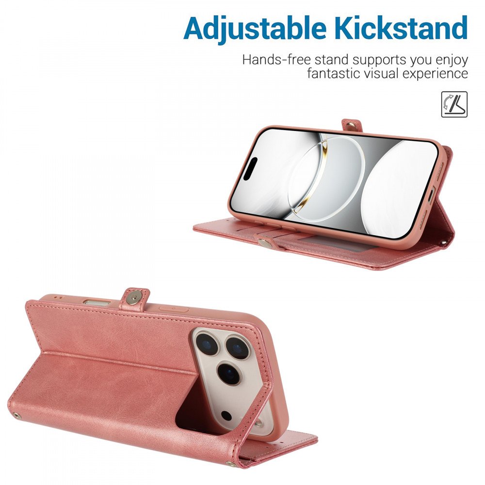 This red wallet phone case for the iPhone 17 Pro combines style and function with durable PU leather, drop protection, and a folding front cover that doubles as a stand. It includes a magnetic closure to keep your phone and cards secure, while offering everyday convenience and easy handling.